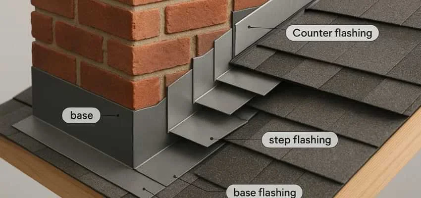 At the uphill side, pan flashing collects and directs runoff around the chimney. For wider stacks in Richardson, we add a cricket to split water so it doesn't pond behind the masonry.