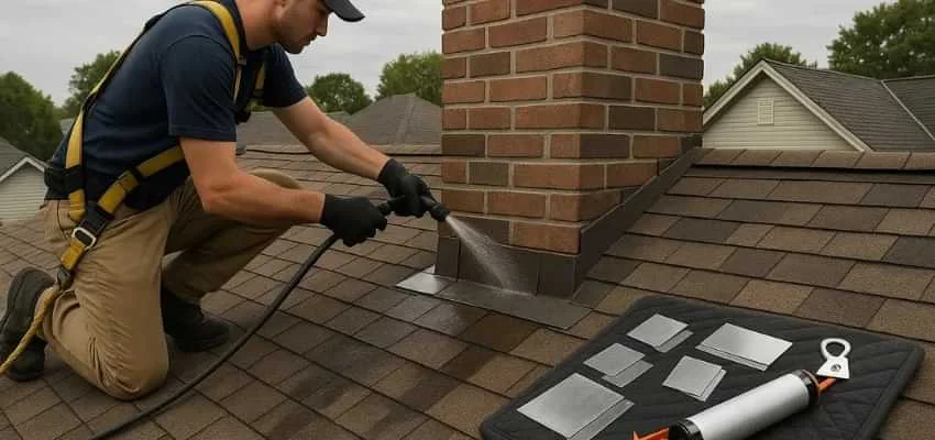 We examine crown slope, cap fit, mortar joints, brick or stone surfaces, and flashing transitions at the roofline. In Richardson this area is often the origin of leaks.
